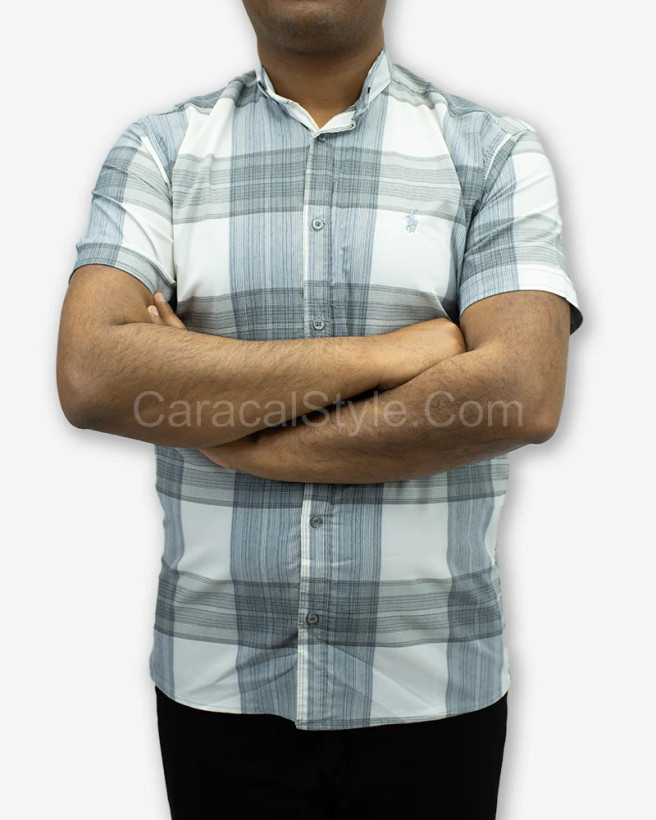 پیراهن آستین کوتاه مردانه چهارخانه، با برش معمولی، بدون جیب، شیک و اسپرت، جنس پارچه نخی، با کش سانی مناسب